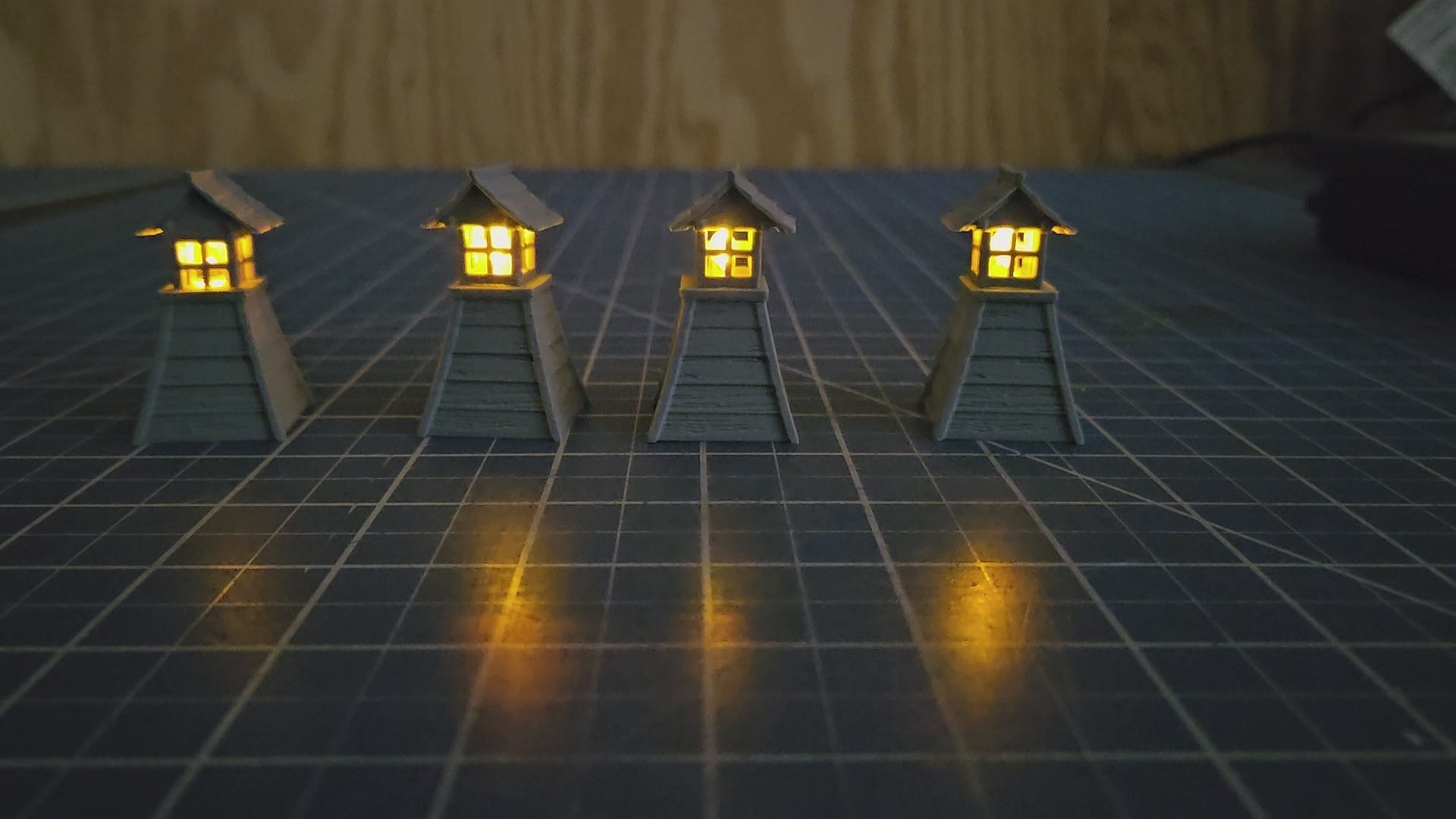 This set comes with two 'lamp' pieces for each lantern. A hollow one that you can wire an LED for a real light, the base is hollow and has two openings for the wires. Or a solid one that you can paint.